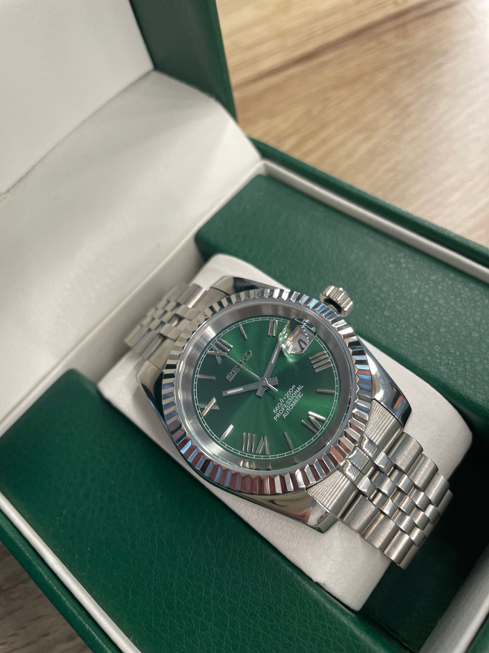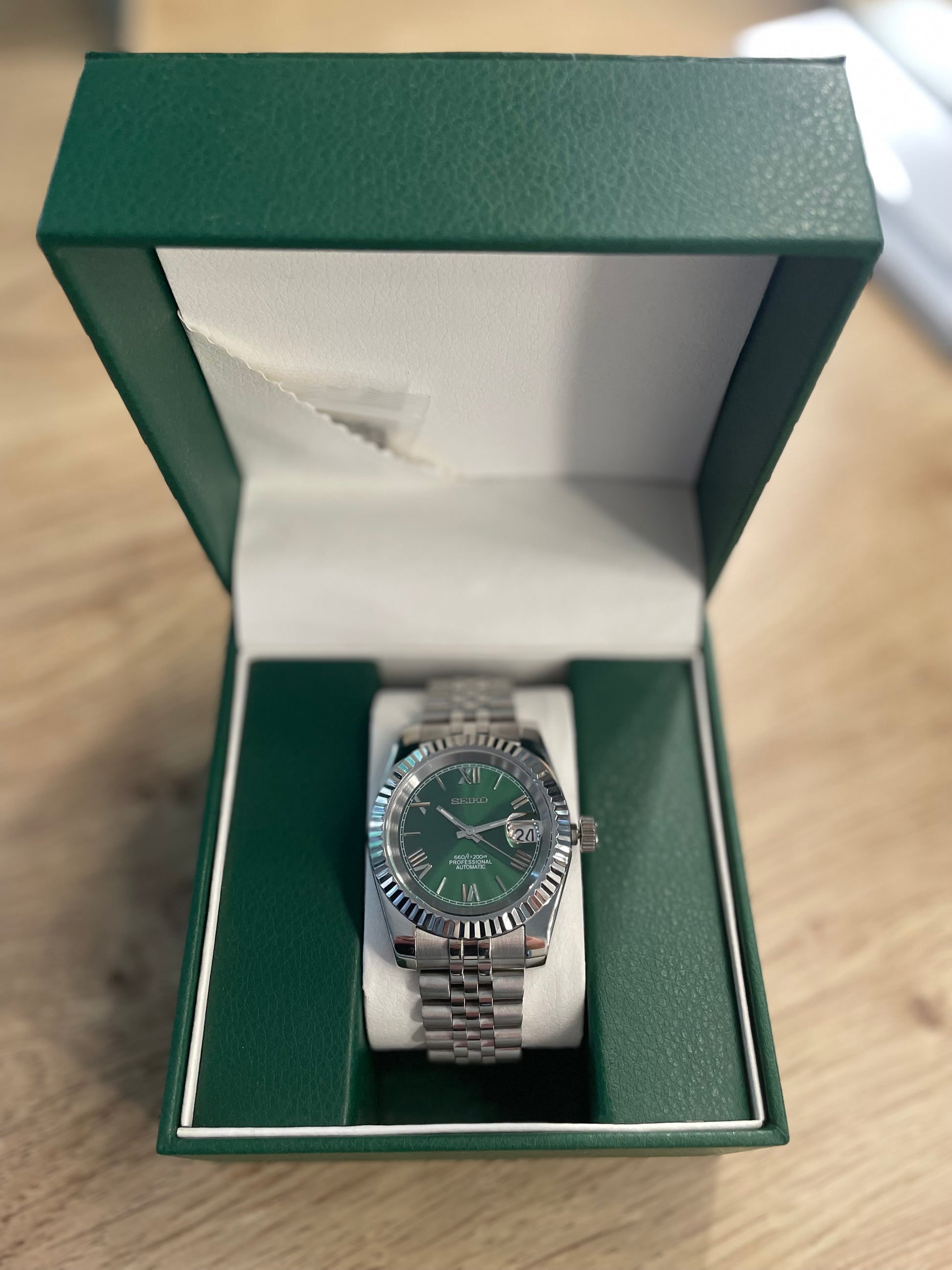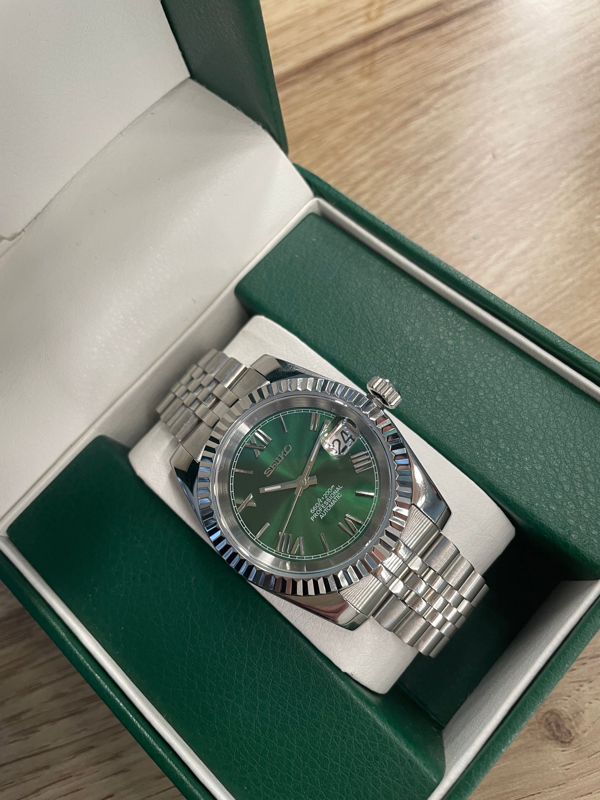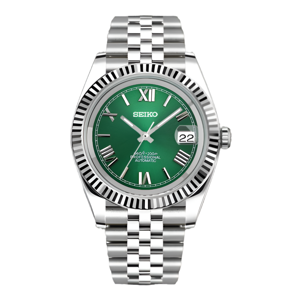 La Seiko Mod Datejust Romandial incarne le raffinement classique, avec son cadran orné de chiffres romains qui rappelle l’élégance des grandes traditions horlogères. Un design intemporel rehaussé par une finition soignée et des performances modernes.
