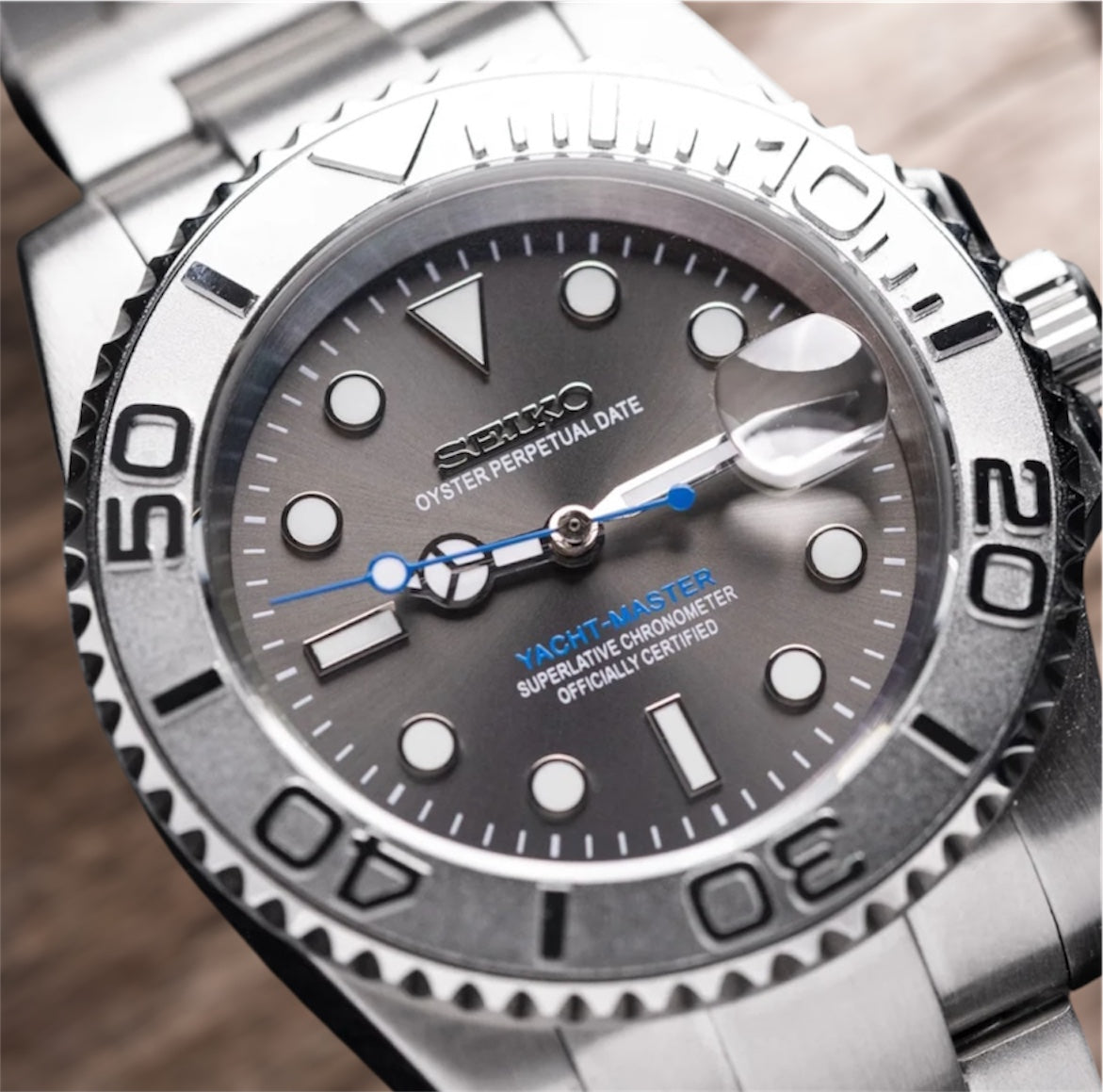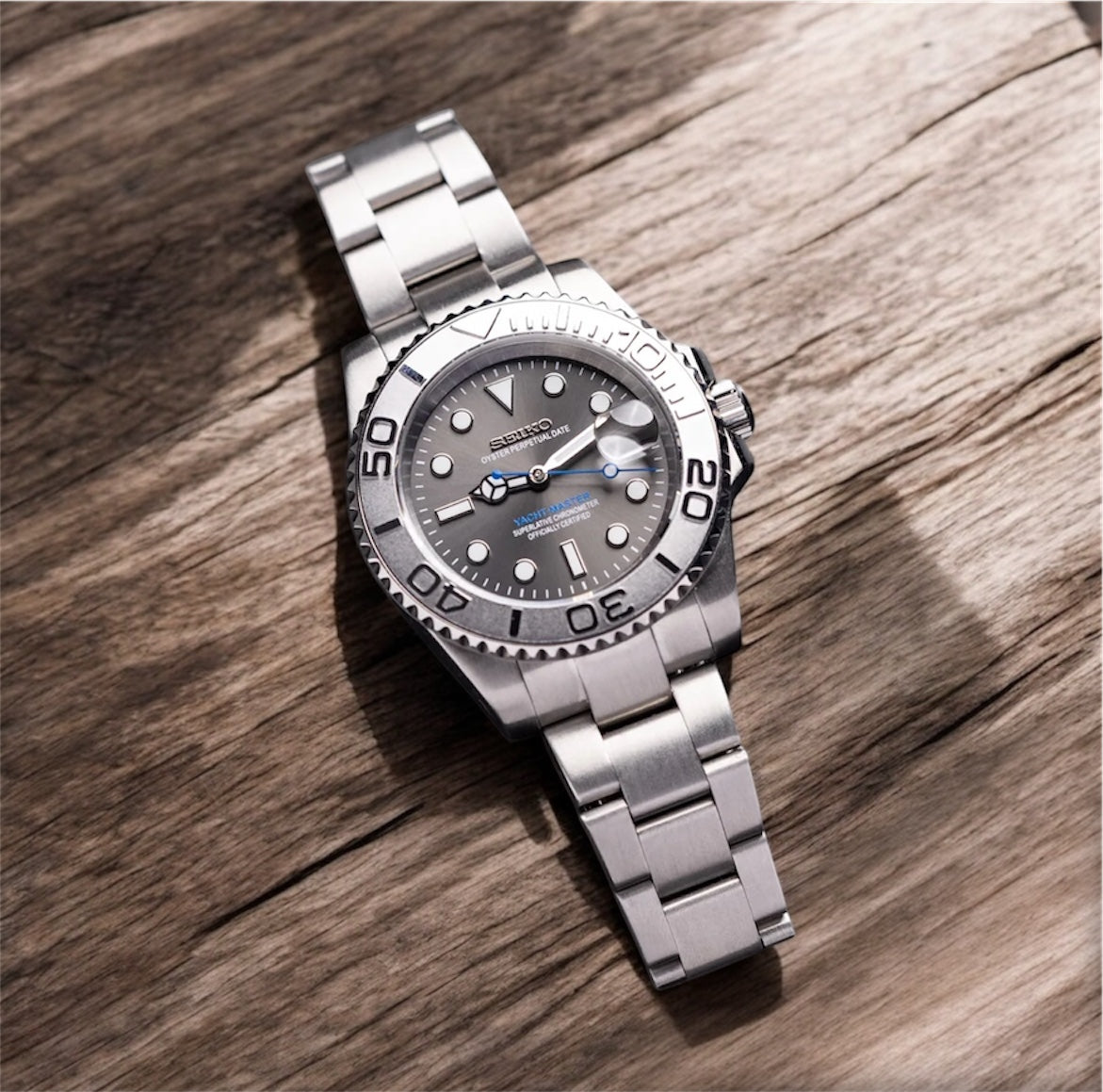 Avec son design affirmé et son allure sobre, la seiko Mod Yacht Master Grise incarne parfaitement l’équilibre entre robustesse et raffinement. Son cadran gris acier aux finitions mates est mis en valeur par des index appliqués luminescents et des aiguilles typées “Mercedes”, assurant une excellente lisibilité en toutes conditions. La lunette tournante crantée, en acier brossé avec marquages gravés, renforce son caractère technique et sportif.